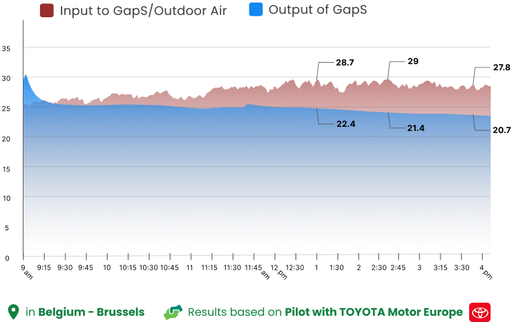 Our system has been rigorously tested and is proven to lower outdoor temperatures by up to −5 to −7.6 degrees Celsius. Tests conducted in Brussels at ambient temperatures up to 29°C show the potential for even greater temperature decreases—up to −10°C as outdoor heat rises.